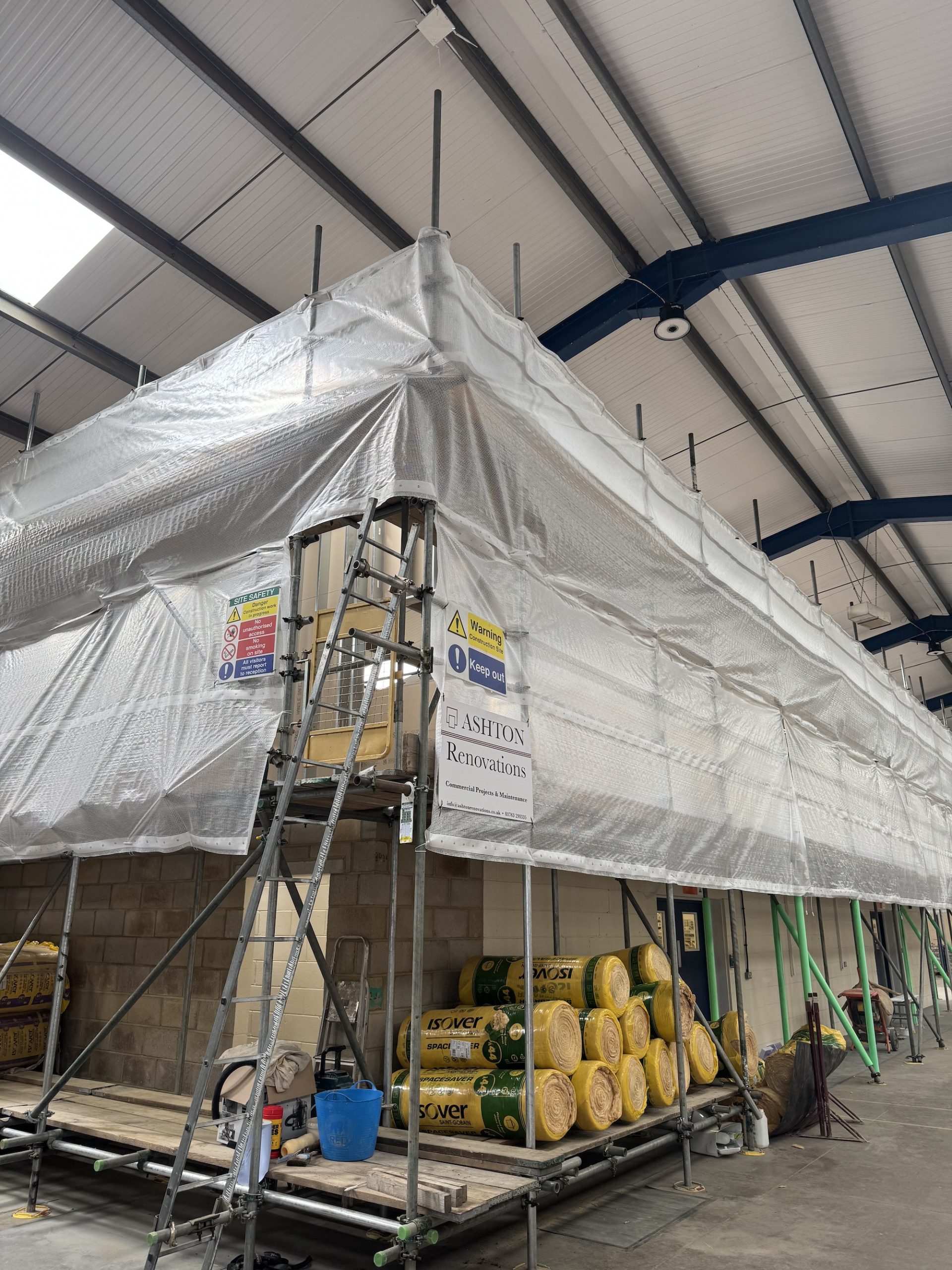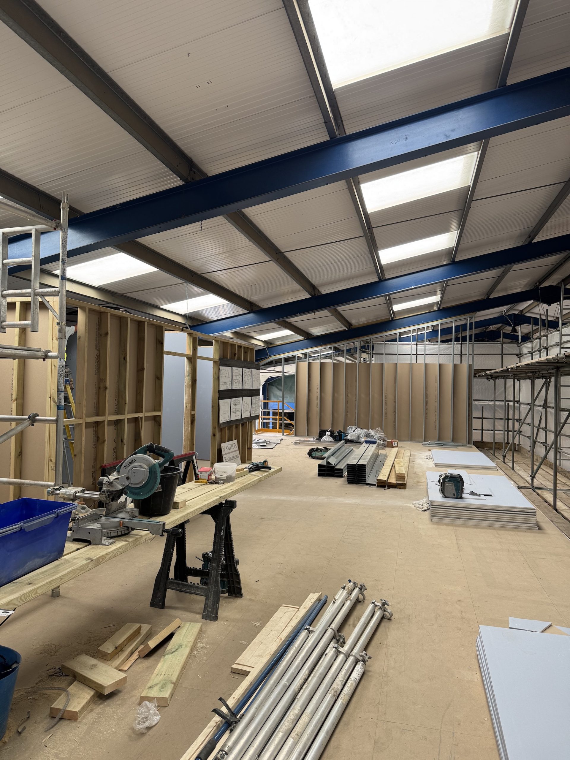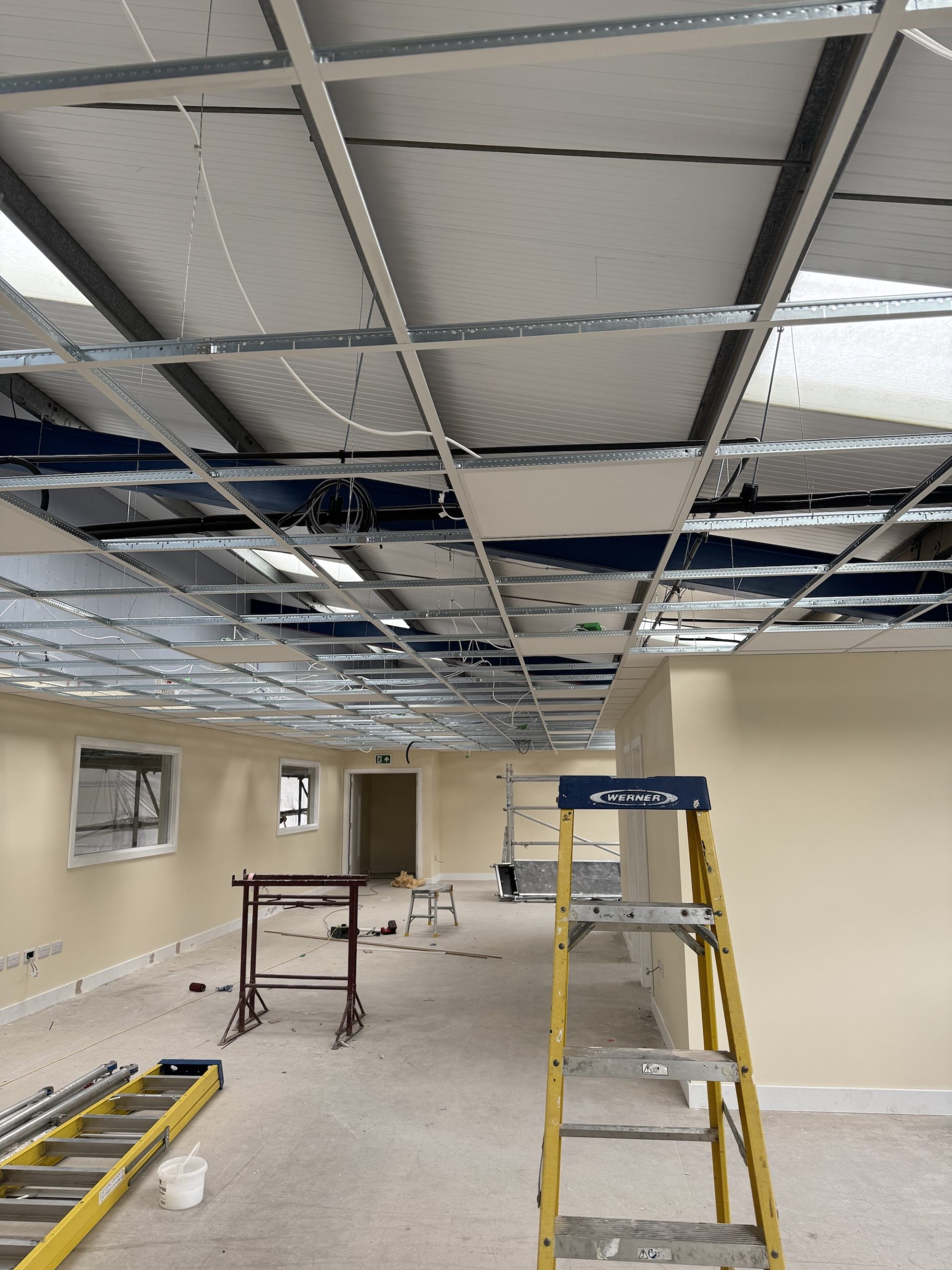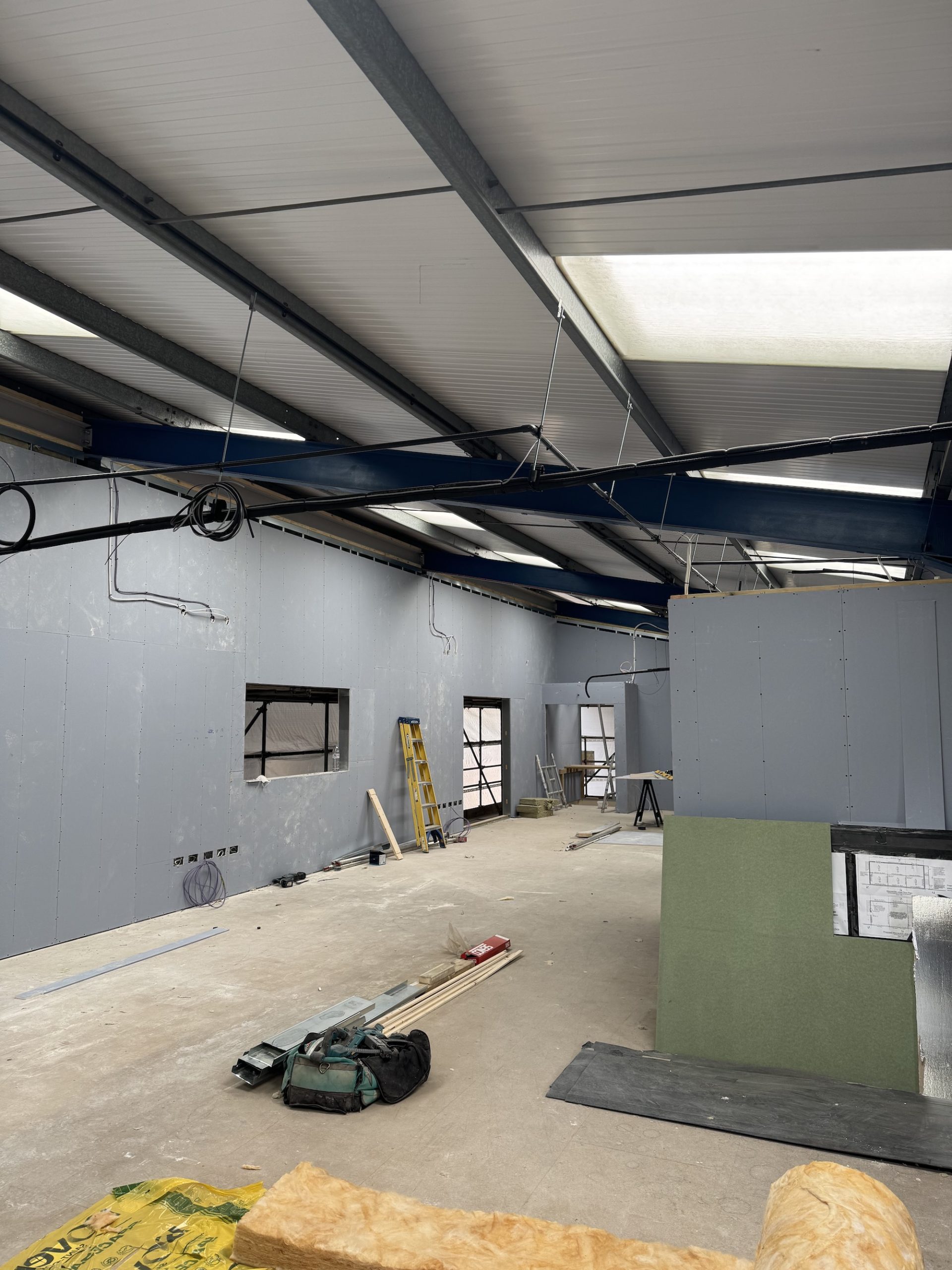 The office was constructed on top of an existing mezzanine, constructed of metal frame studwork, insulated between the studs and finished with acoustic, sound-blocking plasterboard on both sides to provide a required barrier from the noise levels within the barn of which the office is situated.