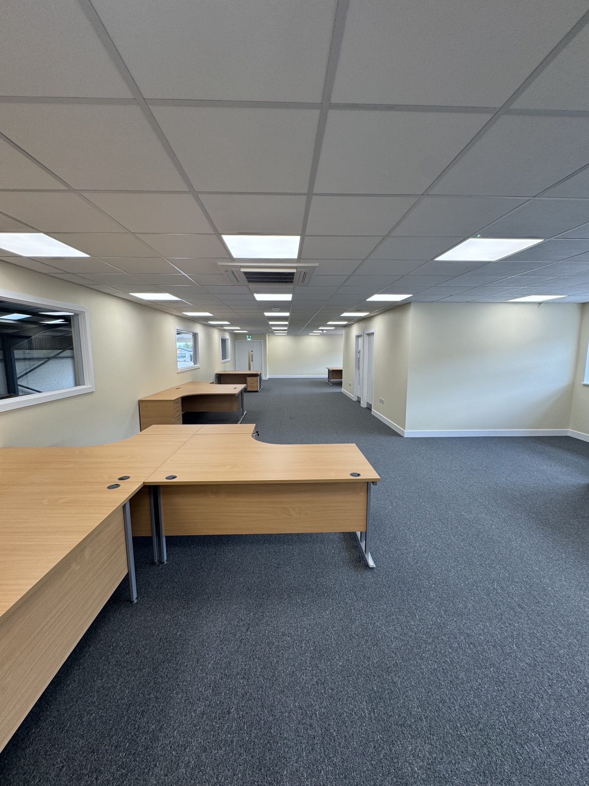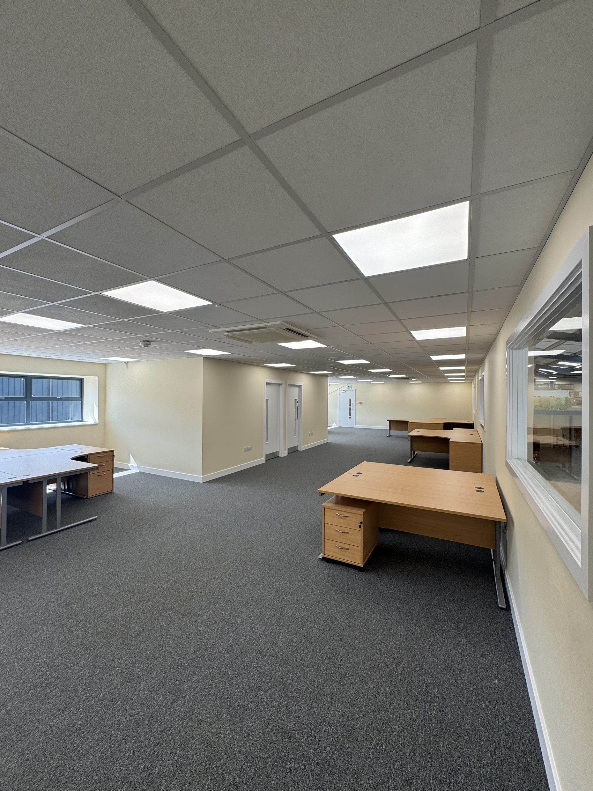 Internal features of this office installation include a suspended ceiling, LED panel lighting, white painted, plywood flush doors with vision panels, dry-lined, plastered and painted walls, and carpet tile flooring throughout. The office is heated and cooled with air-conditioning cassettes in the main office and both meeting rooms.